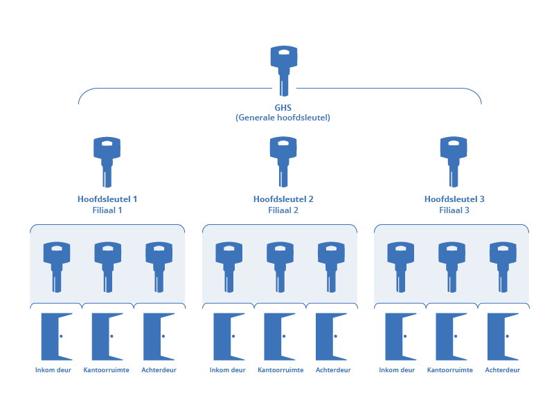 hier opent de hoofdsleutel alle deuren, de groepsleutel opent een groep deuren en de individuele sleutel opent één bepaalde deur. Dit allemaal volgens het opgestelde sluitplan.